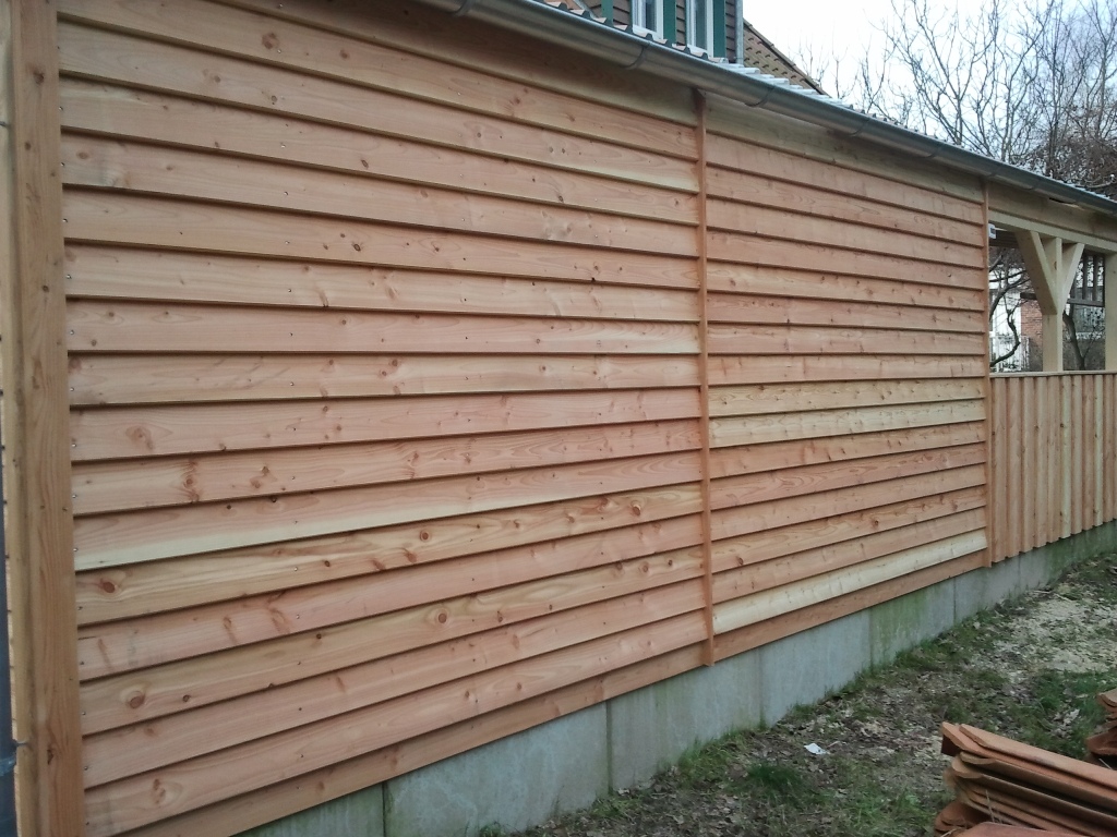 Einen Carport mit Abstellraum an eine bestehende Beton-Fertigarage war der Wunsch der Baufrau und des Bauherrn. Auch sollte dieser sich optisch integrieren und das Gesamtbild mit dem Wohngebäude abrunden.