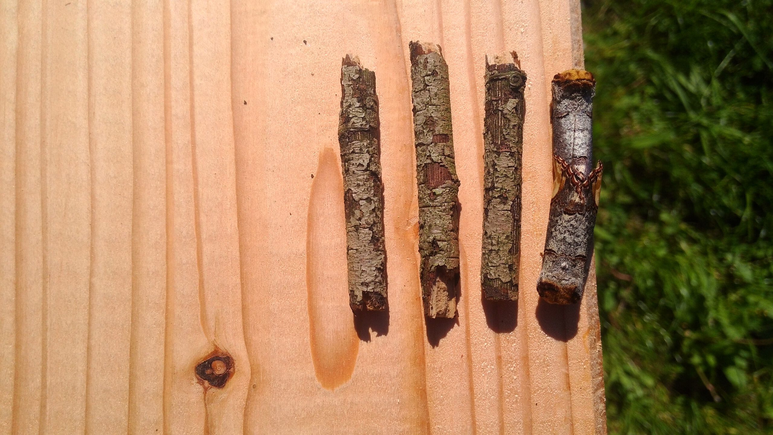 Bei genauerem Hinsehen stellte sich heraus, es sind zwei Mondvögel (heißen tatsächlich Mondvogel (Phalera bucephala)) bei der Raupenplanung. Zur Verdeutlichung legte ich noch 3 Äste daneben.