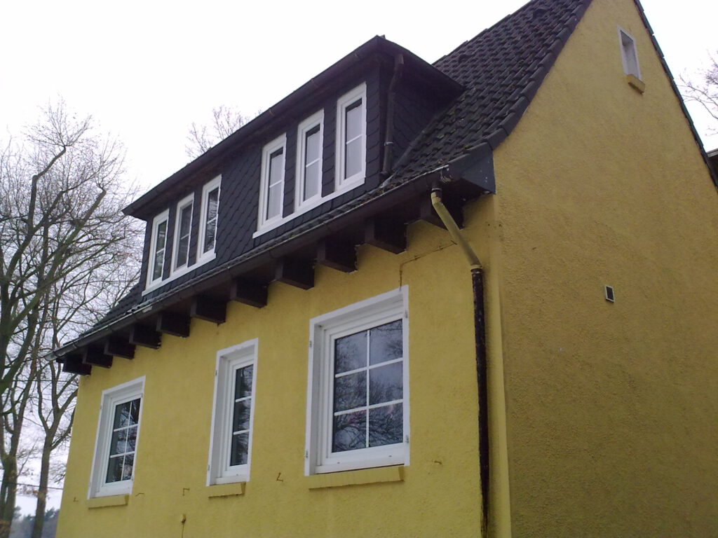 Beide Schornsteine wurden mit Stülpköpfen aus Faserzement wetterfest abgedeckt. Die alten Kunststofffenster wurden durch Holz-Sprossenfenster ersetzt und passen jetzt optisch zu den Fenstern im Neubau. Fensterläden komplettieren das Gesamtbild.