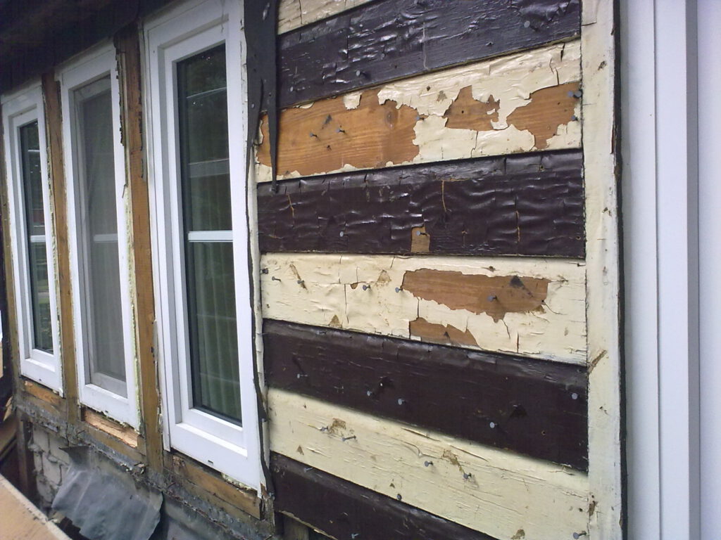 Der Altbauteil eines Einfamilienhauses erfuhr durch uns eine energetische Dachsanierung. Die alten Betondachsteine wurden durch glasierte Dachziegel, die alte Mineralwolle durch Zellulosedämmung ersetzt.