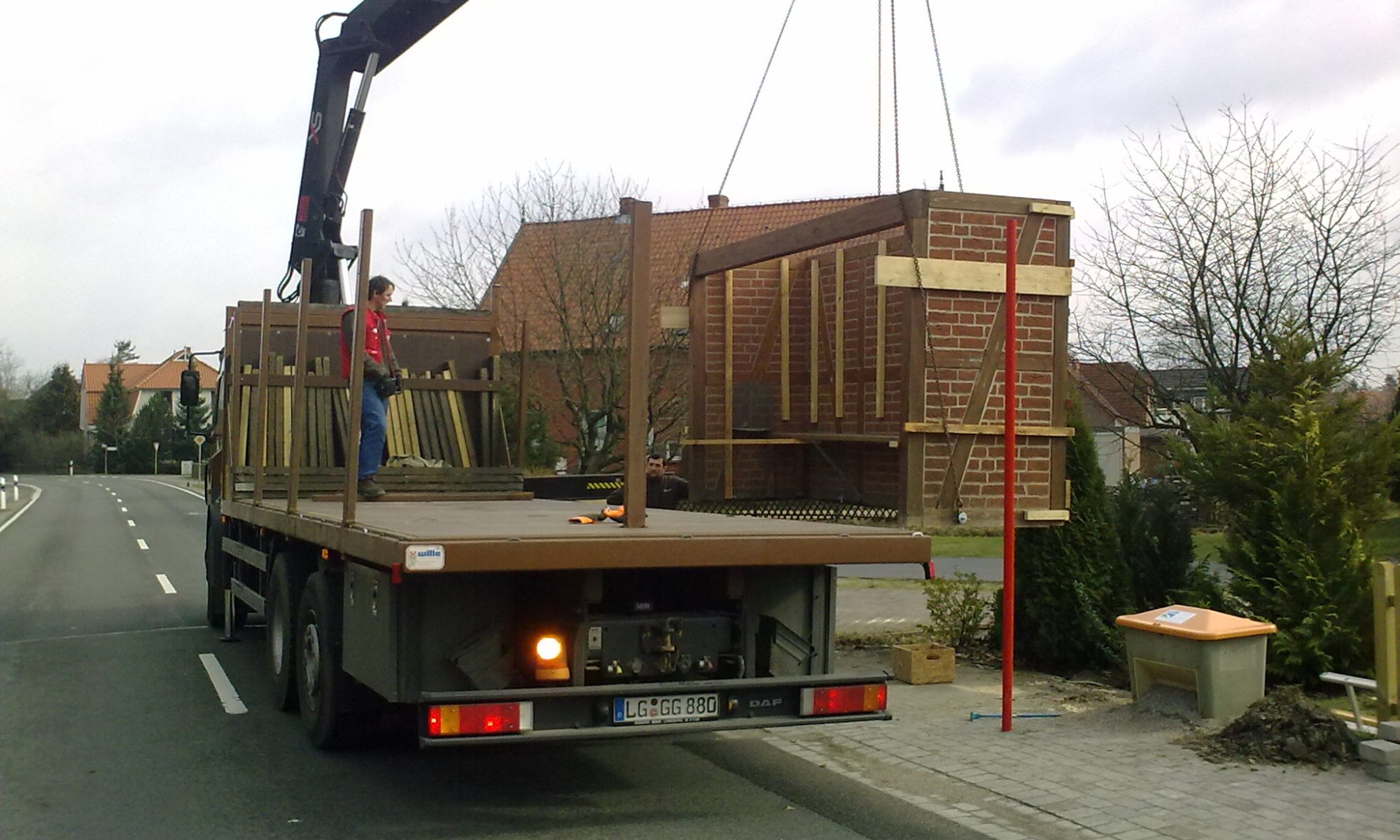Es wurde von uns die Dacheindeckung abgenommen und das Dach als ein Bauteil sowie der Unterbau als zweites Bauteil seperat als ganzes versetzt.